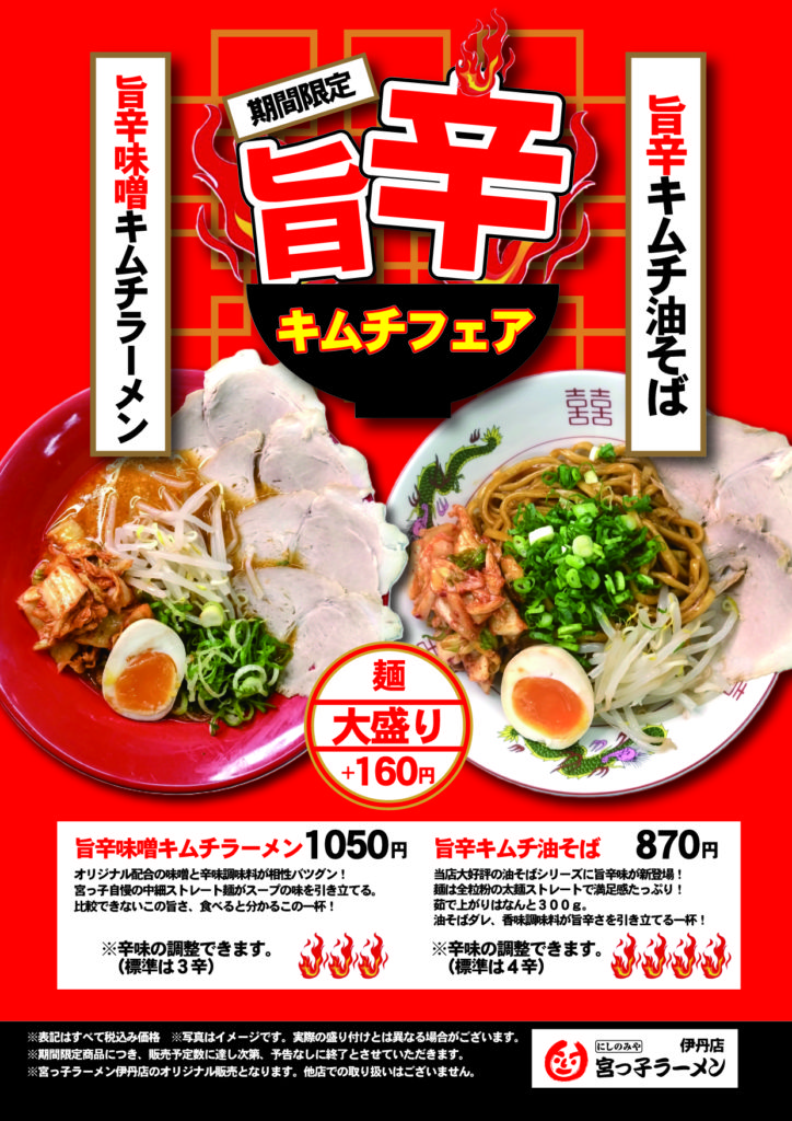 宮っ子ラーメン伊丹店では、季節限定メニューとして「旨辛キムチフェア」を開催いたします。