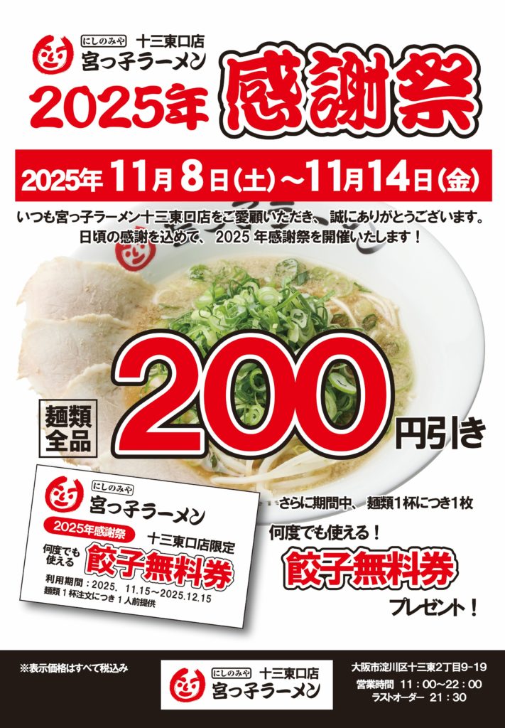 いつも宮っ子ラーメン十三東口店をご愛顧いただき、誠にありがとうございます。